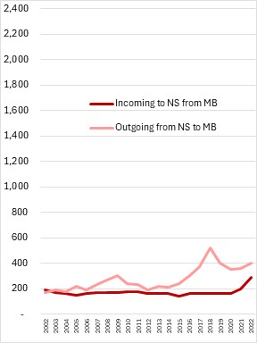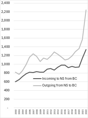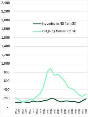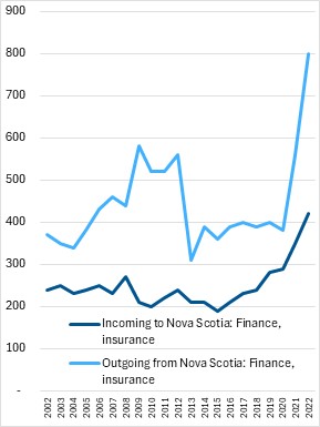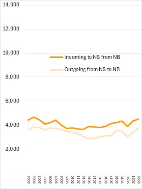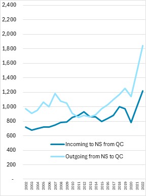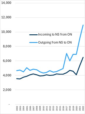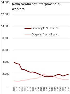 Nova Scotia has its largest interprovincial worker flows with four provinces: Newfoundland and Labrador, New Brunswick, Ontario and Alberta. Outbound interprovincial workers from Nova Scotia destined for Alberta have declined from 10,550 in 2014 to 3,180 in 2022. New Brunswick and Newfoundland and Labrador were net positive contributors of interprovincial workers to Nova Scotia in 2022 while Ontario and Alberta were net negative drains on interprovincial workers from Nova Scotia. The numbers of workers outbound from Nova Scotia to Ontario increased sharply in 2021 and 2022 while the numbers outbound from Nova Scotia to Alberta increased at a slower pace.