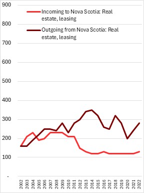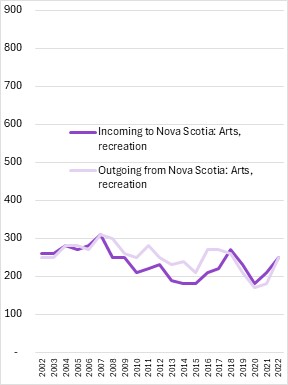 Although the volume of interjurisdictional workers was smaller, there have been notable increases in Nova Scotia workers heading outbound for jobs in information/culture and finance/insurance (these industries also reported higher volumes of inbound workers heading to Nova Scotia). Real estate and arts/recreation/culture both reported less interjurisdictional work (both inbound and outbound) in recent years, despite reporting increases in 2022.