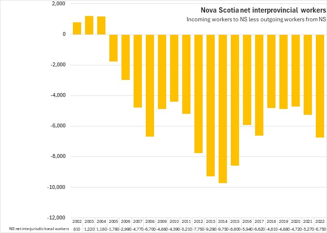 The number of net interprovincial workers refers to those coming to work in Nova Scotia from another province, less those leaving Nova Scotia to work in another province. Net interprovincial workers peaked at -9,730 in 2014. In 2022, net interprovincial workers increased to -6,750.