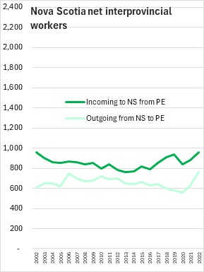 There were net positive interprovincial workers from Prince Edward Island and net negative interprovincial workers with all other provinces (Québec, Manitoba, Saskatchewan and British Columbia). In 2022, there were notable increases in outbound workers from Nova Scotia to British Columbia and Québec.