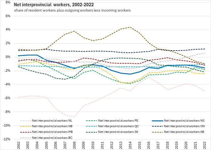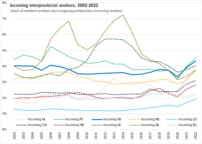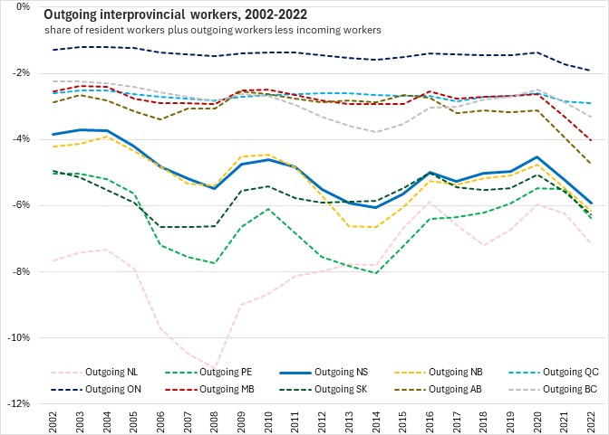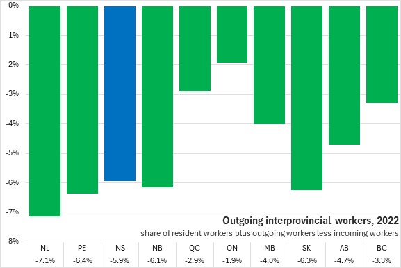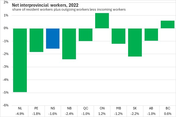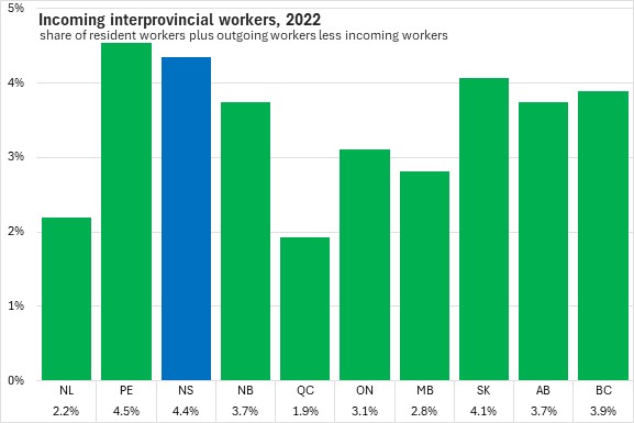 In 2022, Nova Scotia had the second highest proportion of inbound workers (after Prince Edward Island) and the 5th highest share of outbound workers (after the other Atlantic Provinces and Saskatchewan).