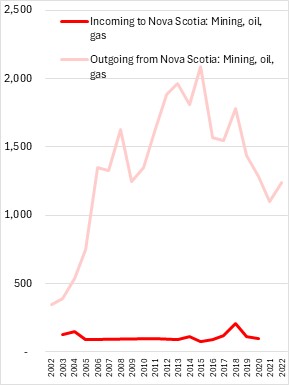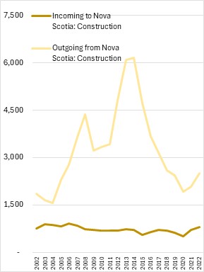 The rise in outbound interprovincial workers from Nova Scotia during 2002-2014 was concentrated in the construction sector and in oil/gas. Much of the decline in outbound workers from 2014-2021 was due to a decline in outbound workers in these sectors (particularly in construction).
