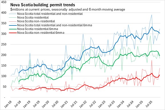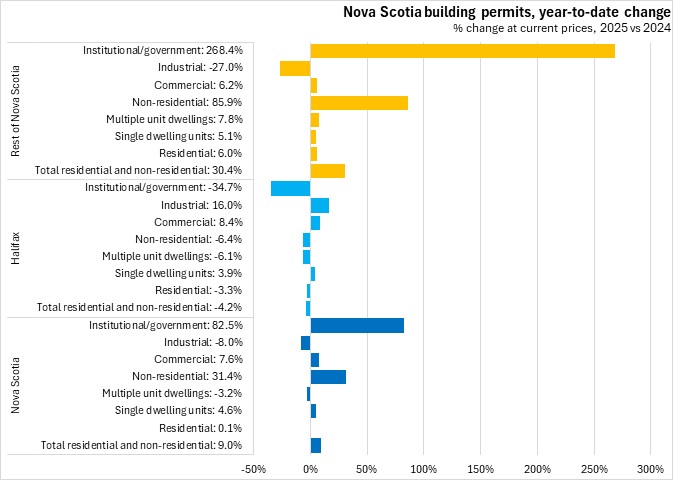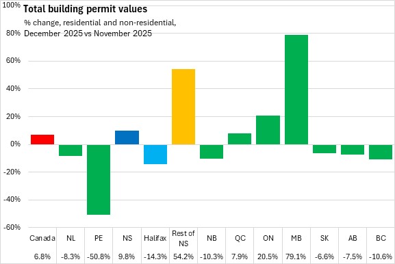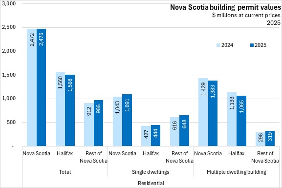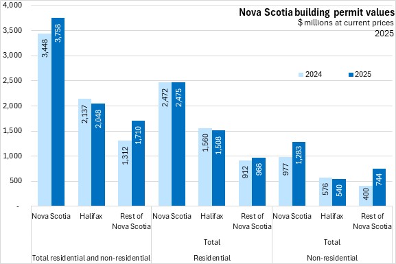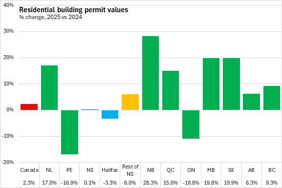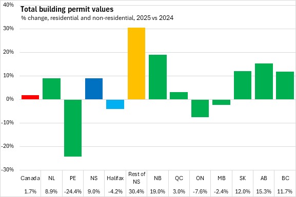 Nova Scotia's total building permits (residential and non-residential) were up 9.0% in 2025 comparing with 2024. Halifax permits declined 4.2% and outside the city permit values increased 30.4%. National permits were up 1.7%. Building permit values were up in seven provinces, with New Brunswick and Alberta reporting the fastest increases. Prince Edward Island reported the fastest decline.