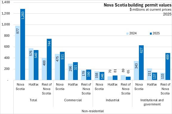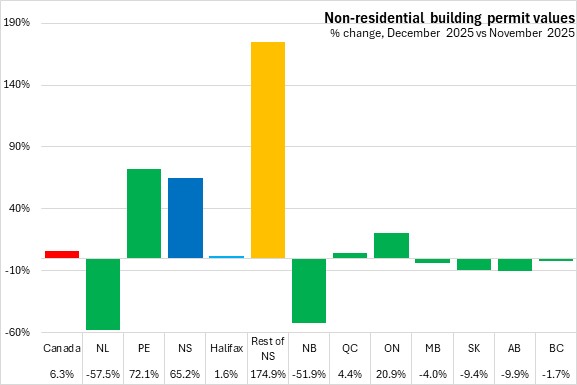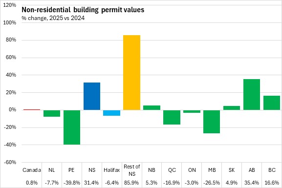Nova Scotia's non-residential building permits rose 31.4% in 2025 (compared to 2024), the second fastest rise in non-residential permit values among provinces after Alberta. Halifax permits declined 6.4% while non-residential permits outside the city rose 85.9%. National non-residential building permit values rose 0.8% on gains in five provinces. Prince Edward Island reported the steepest decline in non-residential permit values.