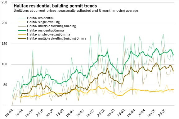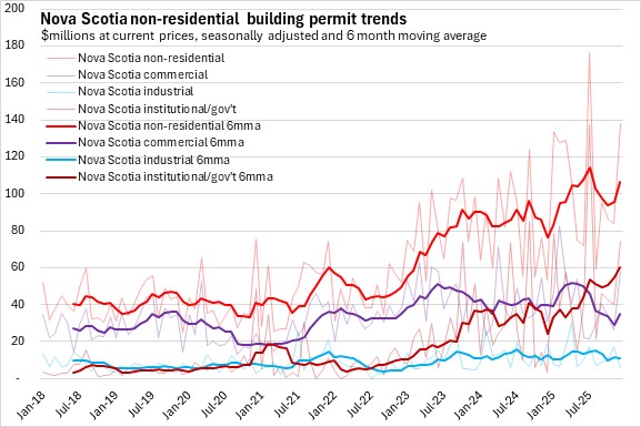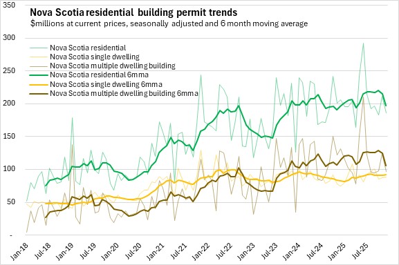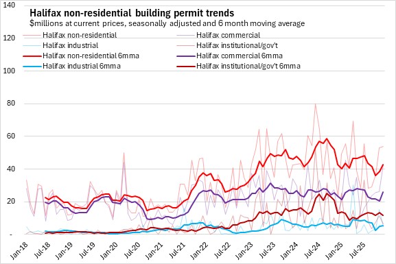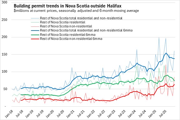 Nova Scotia's non-residential building permit values also reached a plateau from late 2023 through 2024. Non-residential permits have trended up through the first half of 2025 due to notable growth outside the city. In recent months, non-residential building permit values are declining.