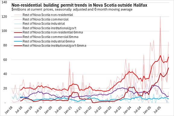 Non-residential building permits have lower values than residential permits. In Halifax, non-residential permits have increased on higher commercial and industrial projects in recent months. Outside the city, permits have exhibited a rise in recent months due to sharp growth in institutional/government permits.