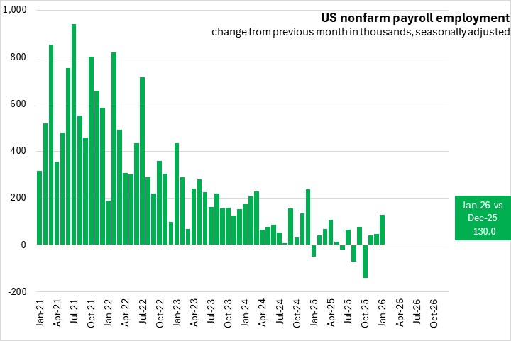 The increase of 130,000 in US nonfarm payroll employment was stronger than the revised gain of 48,000 reported for December 2025. With this release, seasonally adjusted monthly data have been revised in accordance with annual practices. This has resulted in downward revisions to monthly job levels for 2025, with the change in total nonfarm employment for 2025 revised from a gain of 584,000 to a gain of 181,000.