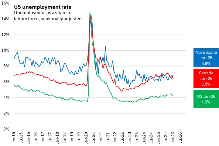 Sources: US Bureau of Labor Statistics retrieved from Federal Reserve Bank of St. Louis; Statistics Canada. US Bureau of Labor Statistics Economic News Release; Table 14-10-0287-01 Labour force characteristics, monthly, seasonally adjusted and trend-cycle