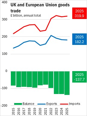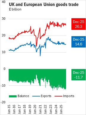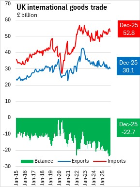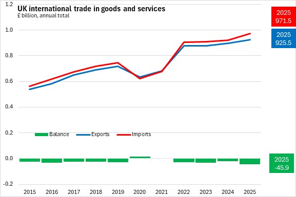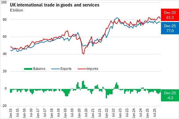 The UK goods and services trade deficit widened by £3.4 billion from December 2024 to December 2025. The goods trade deficit widened by £4.7 billion and the services trade surplus widened by £1.2 billion.