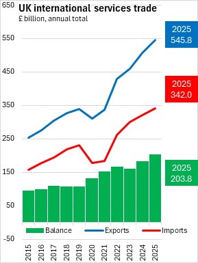 The UK services trade surplus increased by £19.5 billion to £203.8 billion. Exports of services from the UK increased 7.8% (£39.3 billion) to £545.8 billion while imports of services to the UK increased 6.2% (£19.8 billion) to £342.0 billion.