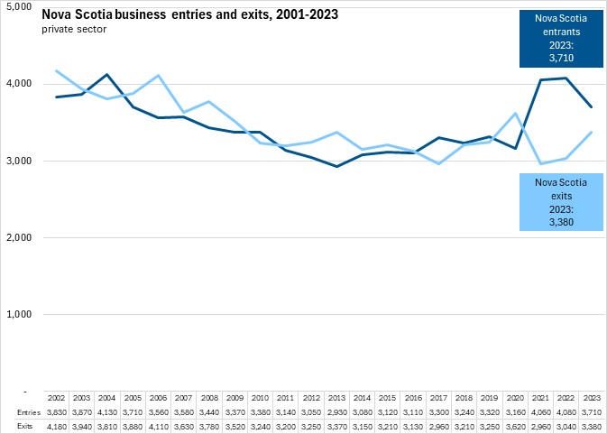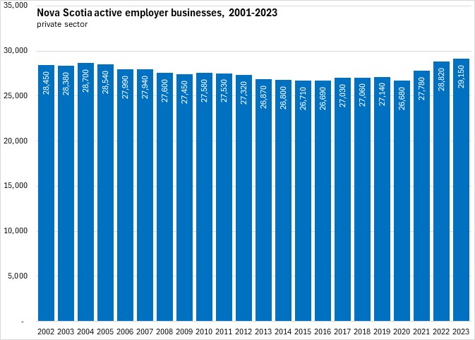 The number of active employer businesses in Nova Scotia rose by 1.1% (+330) to 29,150 in 2023 - the highest number of active businesses in records that date back to 2001. The last three years of data have shown a marked departure from the trend of declining active businesses since 2002.