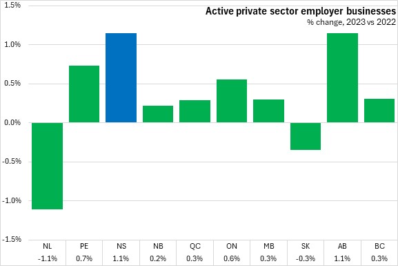 Among provinces, Nova Scotia reported the second fastest growth in active private sector employer businesses in 2023 - only slightly slower than Alberta. All provinces except Newfoundland and Labrador and Saskatchewan reported growing numbers of active businesses from 2022 to 2023.