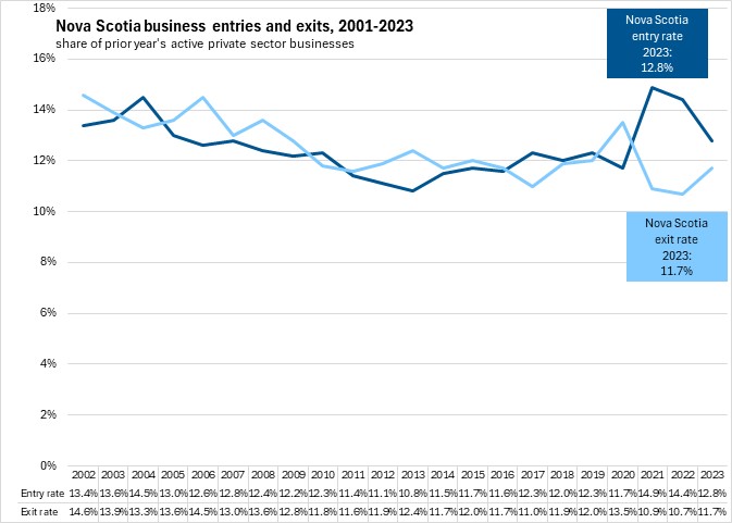 Measured in percentage terms (relative to an average of prior and current year totals), the entry rate for new firms slipped to 12.8 % in 2023, down from 14.4% in 2022. The exit rate for firms rose to 11.7% in 2023, from 10.7% in 2022.