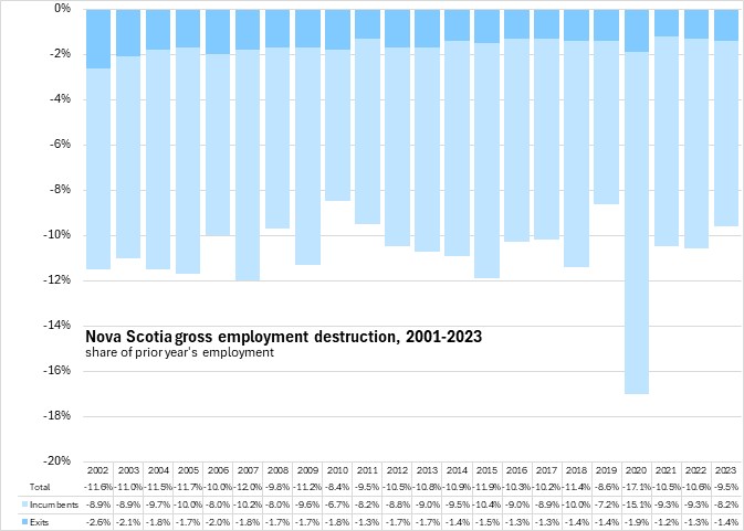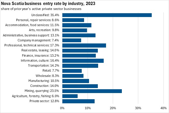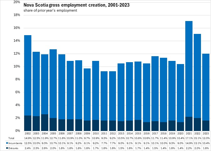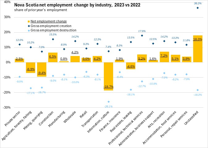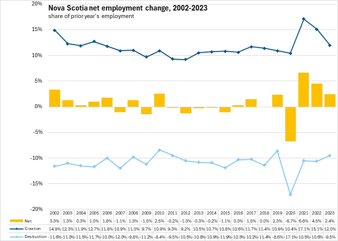 Statistics Canada's business employment dynamics data also examines employment changes in the private sector. In 2023, there was net private sector employment creation of 2.4% in Nova Scotia, representing gross employment creation of 12.0% against gross employment destruction of 9.5%.
