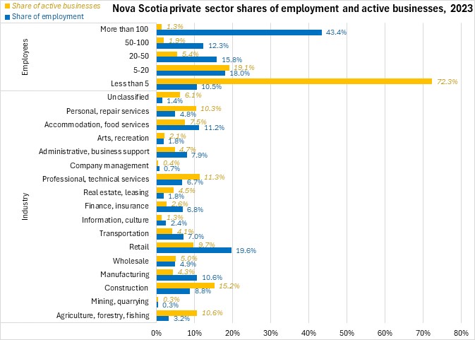 Among industries, the largest contributions to Nova Scotia's gross employment creation in 2023 came from retail and accommodation/food services. By employment size, private sector businesses with over 100 employees made the largest contribution to gross employment creation.