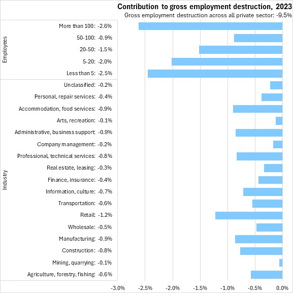 Among industries, retail, manufacturing and accommodation/food services had the largest contribution to Nova Scotia's private sector gross employment destruction in 2023. By size of employment, businesses with between more than 100 employees as well as those with fewer than 5 employees made the largest contributions to gross employment destruction in Nova Scotia in 2023.