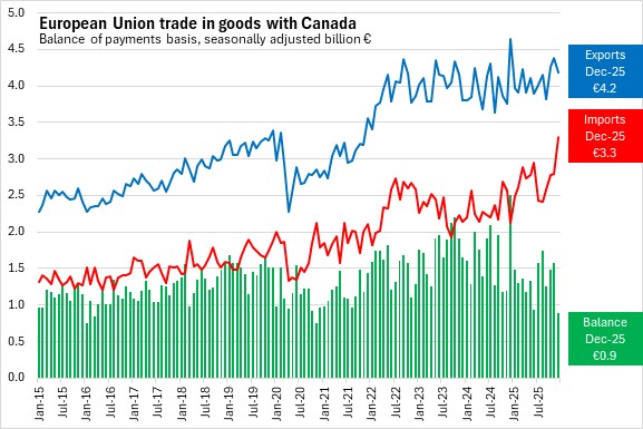 - The European Union's surplus in goods trade with Canada narrowed by €694.5 million to €887.5 million.