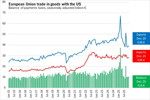 - The European Union's surplus in goods trade with the US widened by €148.1 million to €10.6 billion.