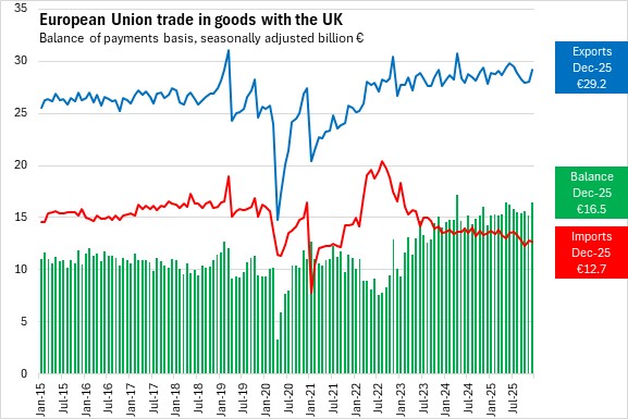 - The European Union surplus in goods trade with the UK widened by €1.2 billion to €16.5 billion.
