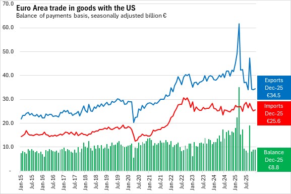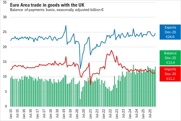 - the Euro Area surplus in goods trade with the UK widened by €1.0 billion to €13.4 billion.