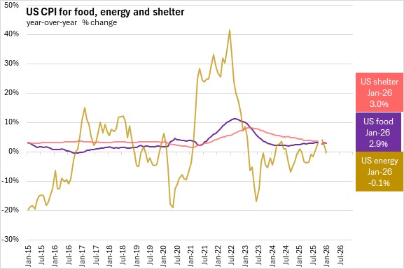 Compared to January 2025, the US energy price index was down 0.1%. The gasoline price index was down 7.5%. The food index rose 2.9% and the shelter index was up 3.0% year-over-year.