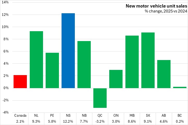 The sales values of new vehicles increased 11.2% in Nova Scotia in 2025, the fastest gain among provinces. National sales values were up 0.9% with gains in all provinces except Québec and British Columbia.