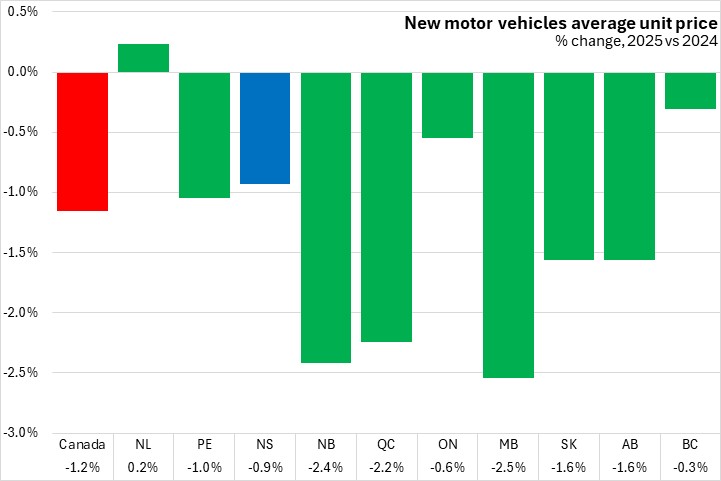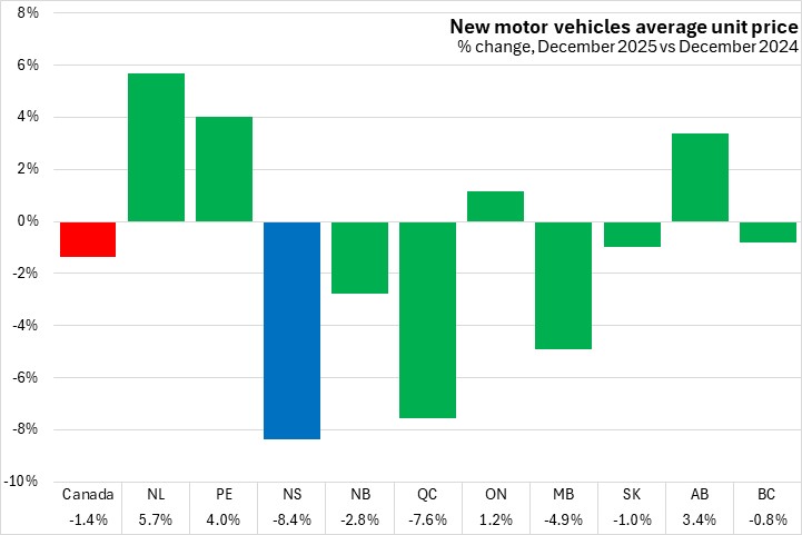 Compared to December 2024, average unit prices were down 8.4% in Nova Scotia in December 2025, the steepest decline among provinces. Average unit prices were down 1.4% nationally with declines in six provinces. Newfoundland and Labrador had the fastest year-over-year increase in average motor vehicle prices.