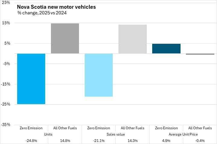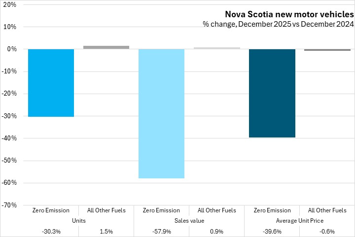 Zero emission vehicle unit sales were down 30.3% in December 2025 compared with December 2024, while sales values declined 57.9% and average unit prices decreased 39.6%. The low overall number of zero emission vehicles sold in Nova Scotia (221 in December 2025) can lead to volatility in unit sales, sales values, and prices. Other fuel type vehicles, which account for the majority of vehicles sold (3,082 units), saw unit sales increase 1.5% while sales values increased 0.9%, and the average unit price for other fuel type vehicles fell 0.6%.