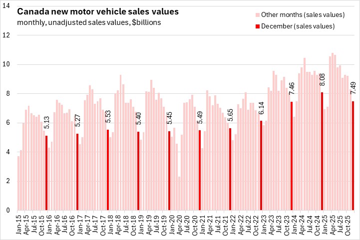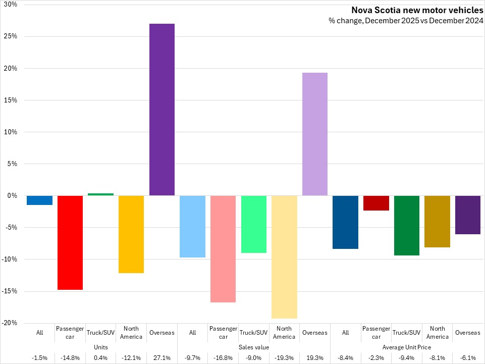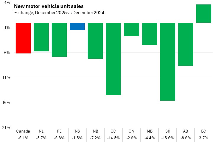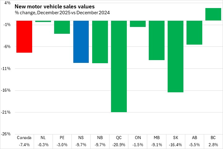The sales values of new vehicles decreased 9.7% in Nova Scotia from December 2024 to December 2025. National sales values were down 7.4% with declines in all provinces except British Columbia. Québec had the fastest decline in year-over-year sales values.
