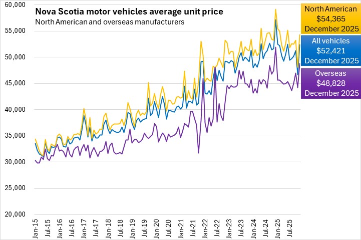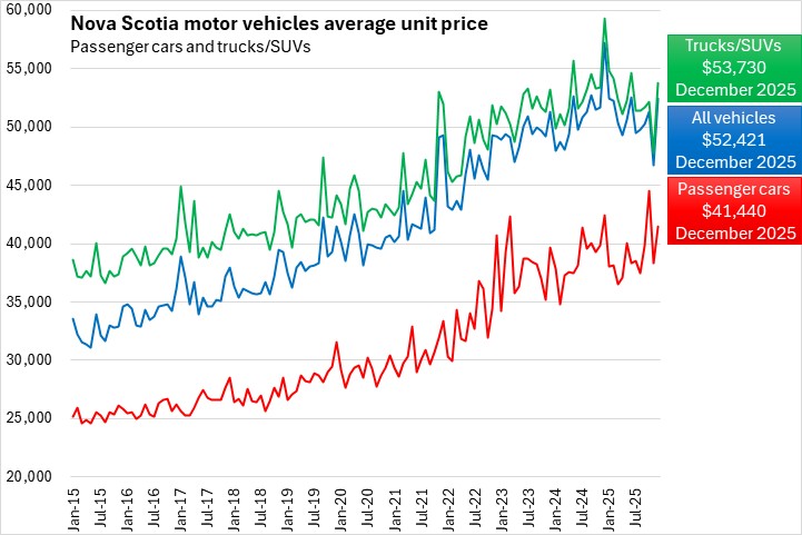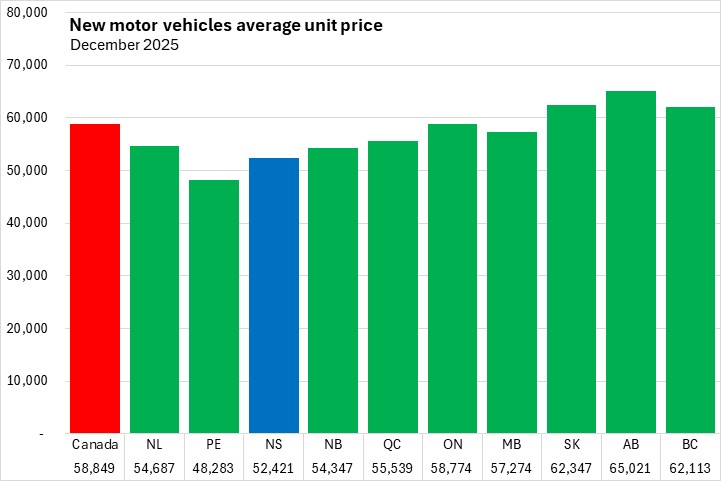 The average price of a new vehicle in December 2025 was $52,421 in Nova Scotia - second lowest among provinces ahead of Prince Edward Island. Nationally, the average price of a new vehicle was $58,849 in December with the highest value in Alberta.