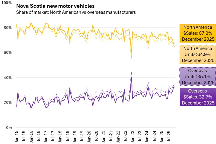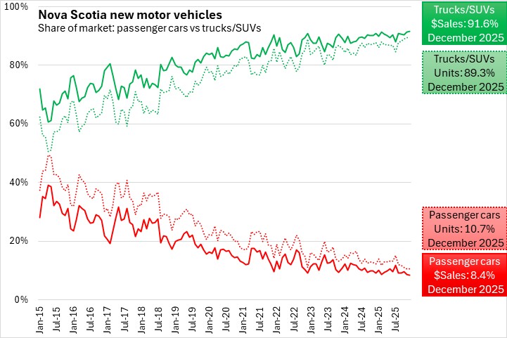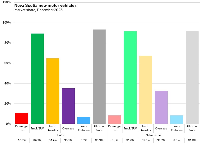 In December 2025, trucks/SUVs accounted for 89.3% of unit sales and 91.6% of sales values. North American manufacturers accounted for 64.9% of Nova Scotia's unit sales and 67.3% of sales values in December 2025. Zero emission vehicles made up 6.7% of unit sales, and 8.4% of sales values, while all other fuel types accounted for 93.3% of unit sales and 91.6% of sales values.