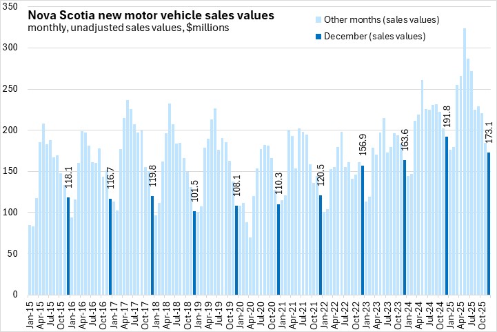 Nova Scotia's unit sales of 3,303 in December 2025 was slightly lower than the same month in 2024, but above the same month in previous years after 2015.