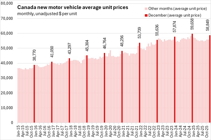 Prices for trucks/SUVs (the bulk of the market) have fallen from their recent peaks at the end of 2024. Prices for passenger cars posted a rebound in December after a decline in November 2025.