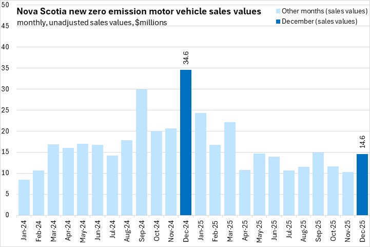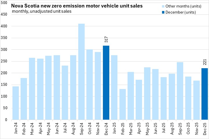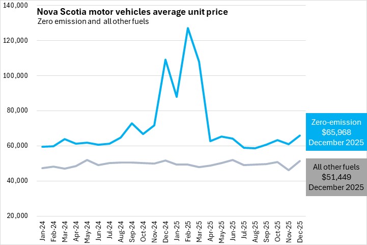 Average prices for zero-emission vehicles rose sharply in late 2024 and have subsequently fallen below previous levels. The low overall number of zero emission vehicles sold in Nova Scotia (221 in December 2025) can lead to volatility in prices.