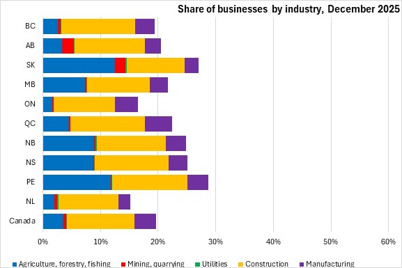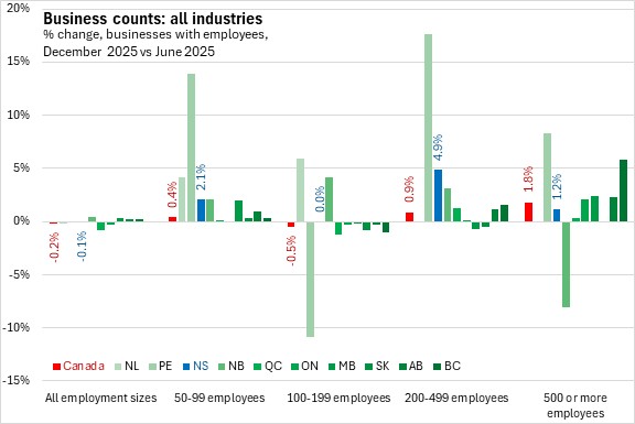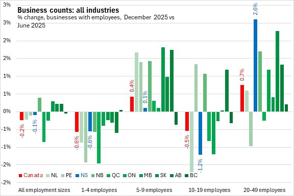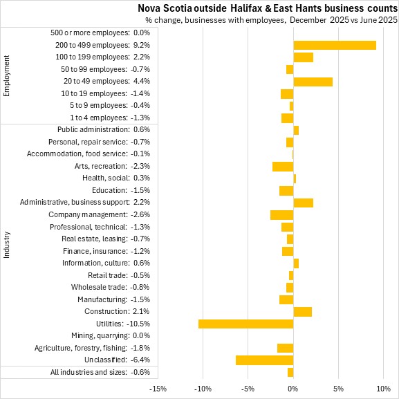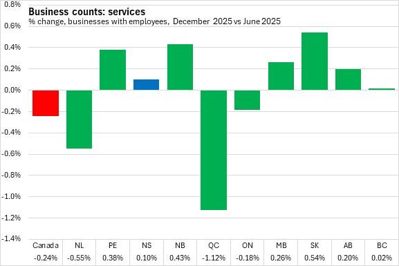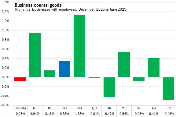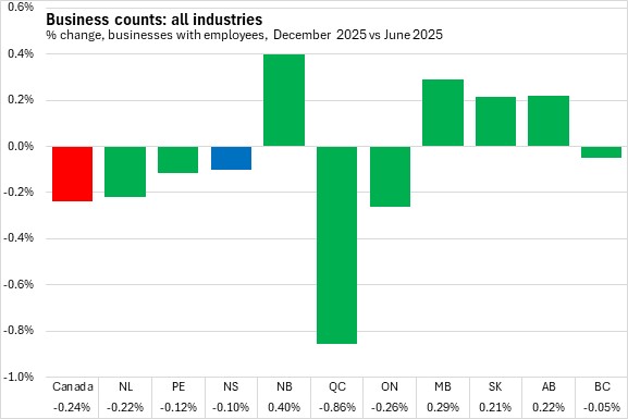 February 13, 2026BUSINESS COUNTS, DECEMBER 2025 The number of business locations in Nova Scotia with employees contracted 0.1% between June 2025 and December 2025, largely due to a decline in the number of businesses unclassified by industry. Across Canada, business counts fell by 0.24% with declines in six provinces, led by Québec. New Brunswick reported the fastest growth in business counts over this period.