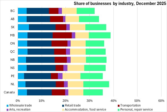 Distribution (wholesale, retail, transportation) and personal service industries make up a more consistent share of business counts across the country, with somewhat higher shares in Newfoundland and Labrador and Manitoba.