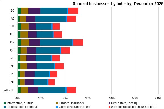 Real estate, finance, professional services, information and culture, company management as well as administrative and business support businesses are notably more concentrated in Canada's four most urban provinces: Ontario, British Columbia, Alberta and Québec.
