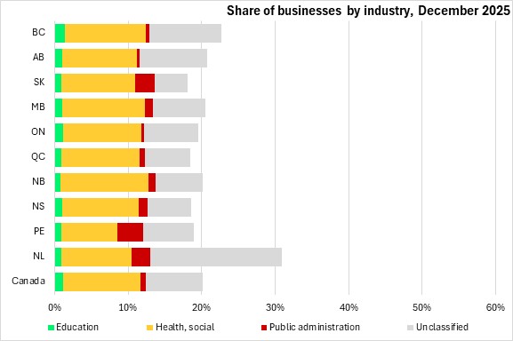 Health, social, education and public administration businesses make up a similar share of business counts across most provinces. Newfoundland and Labrador reported a higher portion of unclassified businesses.