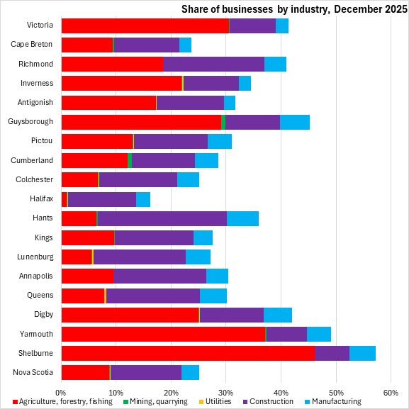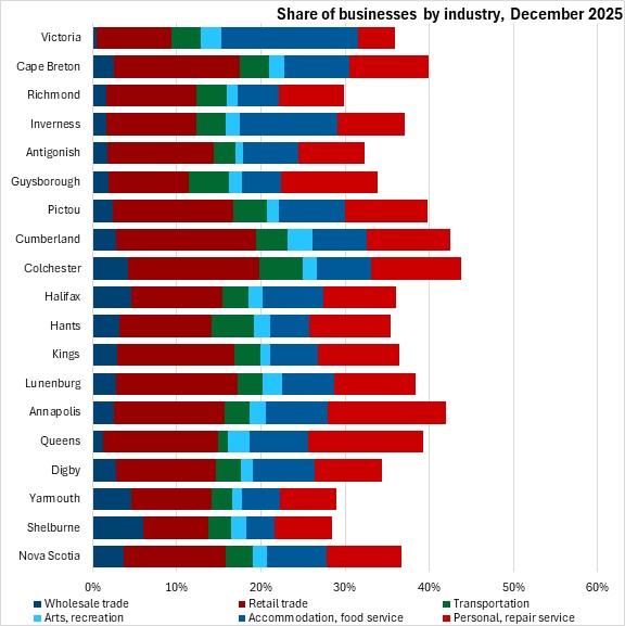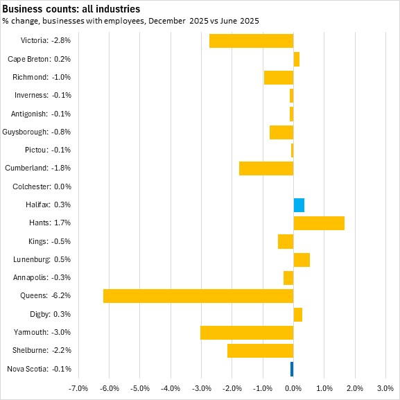 Among Nova Scotia's counties, only Cape Breton, Hants, Halifax, Lunenburg and Digby reported growth in business counts from June 2025 to December 2025. Queens, Yarmouth, Victoria and Shelburne Counties reported the sharpest declines in business counts.