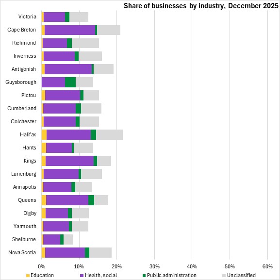 Health, social, education and public administration businesses were larger shares of all businesses in Halifax, Antigonish, Cape Breton, Kings and Queens counties.