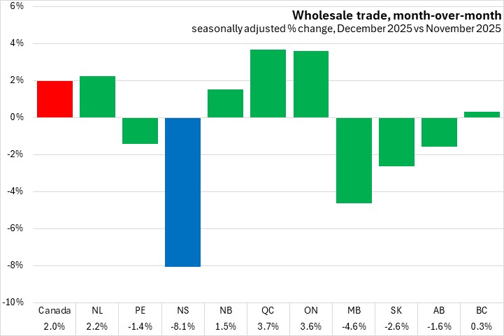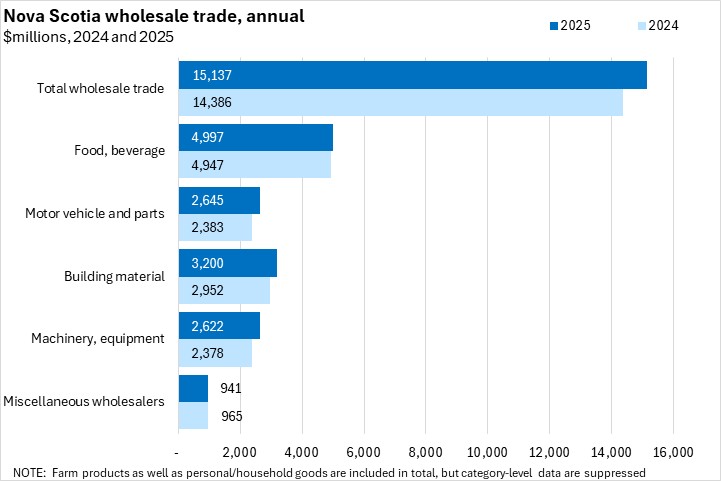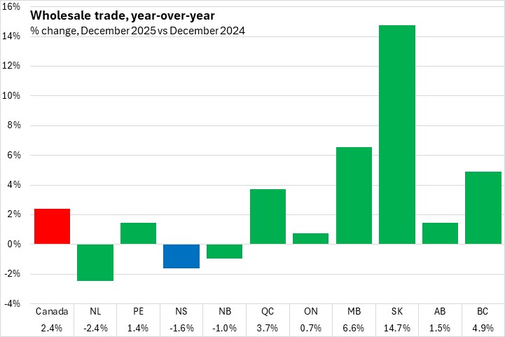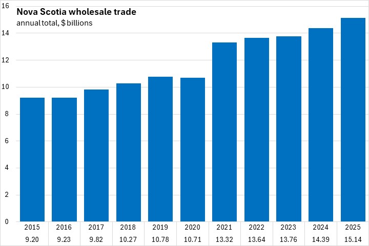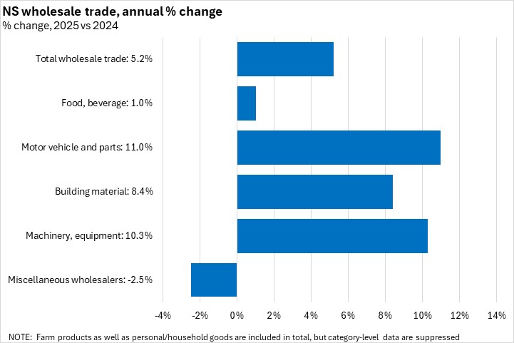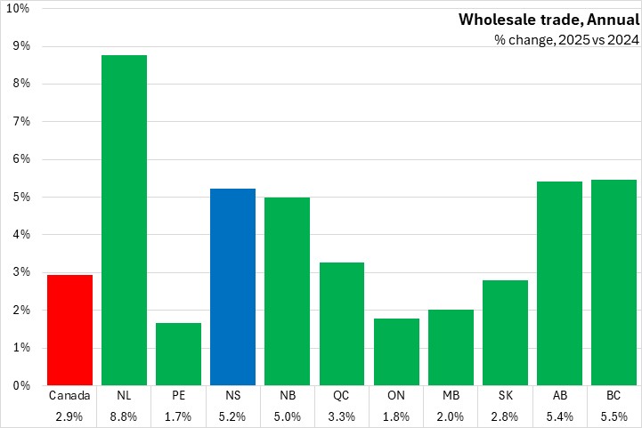 Nova Scotia wholesale trade increased 5.2% in 2025 compared to 2024. Canada's wholesale trade increased 2.9%. All provinces reported annual increases in wholesale trade. Newfoundland and Labrador reported the fastest gain while Prince Edward Island, Ontario, and Manitoba all reported slower growth.