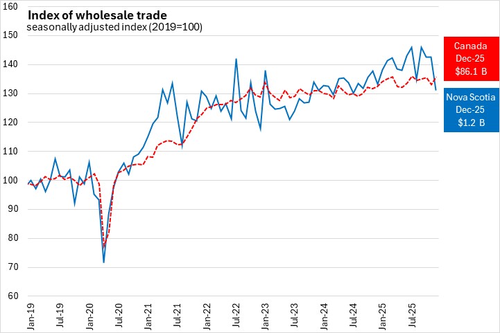 National wholesale trade (excluding petroleum products and oilseed and grains) has slowed in 2025. Nova Scotia's growth in wholesale trade fell behind the national rate in December, the first time this occurred since October 2023.