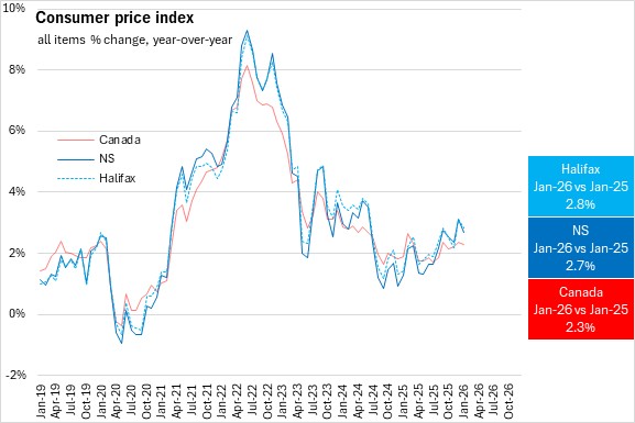 All items: Consumer prices in Nova Scotia were down 0.1% in January 2026 compared with December 2025. Nationally, consumer prices were unchanged compared to the previous month. In Halifax consumer prices were down 0.1%.
