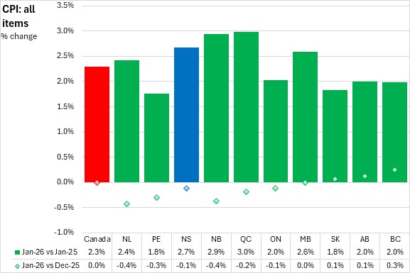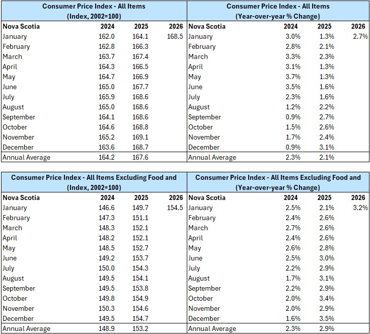 Nova Scotia’s all items Consumer Price Index (CPI) grew 2.7% year-over-year in January 2026, down 0.4 percentage points from the previous month.