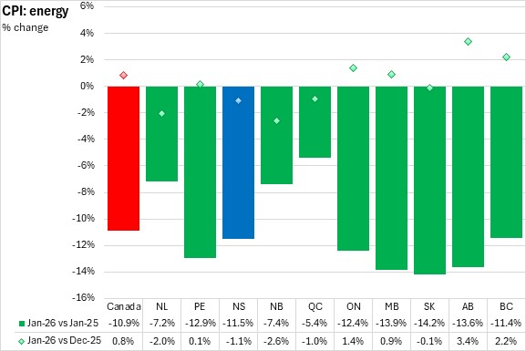 Energy prices play a significant role in inflation rates. Nova Scotia's energy prices (and overall inflation) are more sensitive to fluctuations in the global price of crude oil. Nova Scotia's energy prices were down 11.5% from January 2025 to January 2026. Year-over-year energy prices were down 10.9% nationally with all provinces reporting decreasing energy prices (fastest: Saskatchewan). Québec reported slowest decline in energy prices year-over-year.