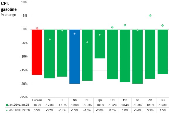 On a monthly basis, Nova Scotia's all items CPI was down 0.1% from December 2025 to January 2026. National prices were also down 0.2% on average. There were price decreases reported in six provinces (led by Newfoundland and Labrador and New Brunswick) with the fastest increase reported in British Columbia.