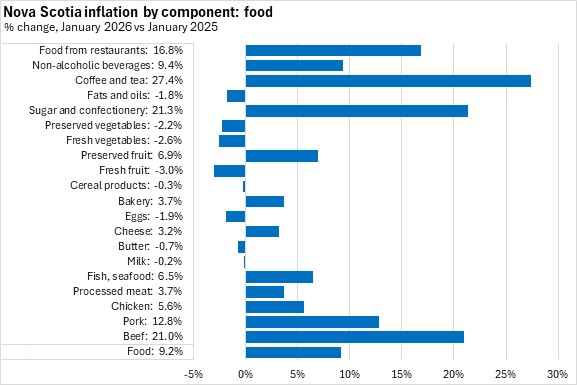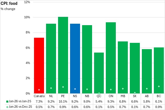 Food prices increased 9.2% in Nova Scotia year-over-year, above national average food price inflation of 7.3% in January 2026. Food prices were up in every province, led by Prince Edward Island.
