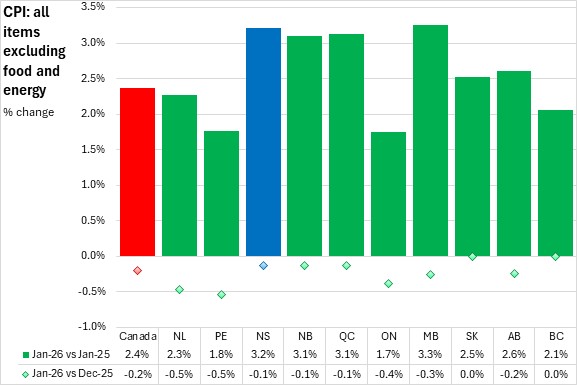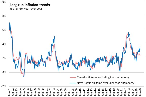 Food and energy prices are heavily influenced by volatile global commodity markets. Nova Scotia's underlying inflation rate excluding food and energy was 3.2% from January 2025 to January 2026. Nationally, inflation excluding food and energy was 2.4% with year-over-year increases in all provinces. Manitoba reported the fastest increases in inflation excluding food and energy prices (followed by Nova Scotia) while Ontario and Prince Edward Island reported the slowest growth.