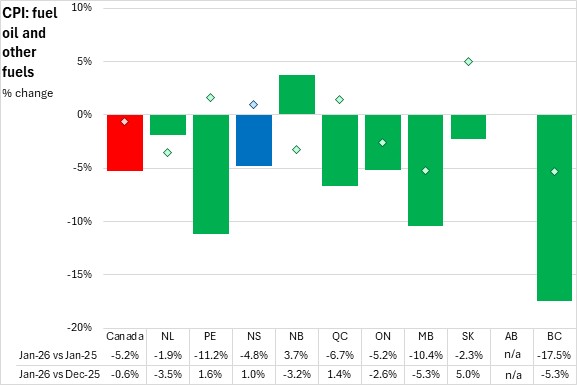 Nova Scotia's year-over-year fuel oil prices were down 4.8% in January 2026 compared with January 2025. Nationally, the fuel oil and other fuels price index decreased 5.2% compared to January 2025, with all provinces except New Brunswick reporting declines. British Columbia reported the fastest decline.