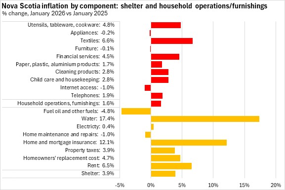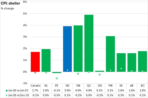 Year-over-year shelter cost inflation was 3.9% in Nova Scotia in January 2026. National shelter prices were up 1.7% with increases in all provinces except Prince Edward Island. Québec had the fastest increase in shelter prices.
